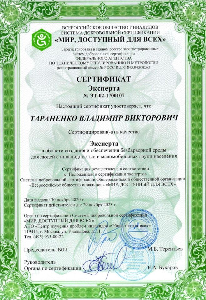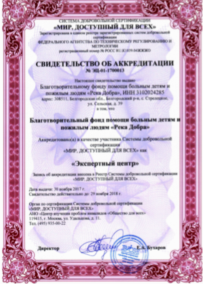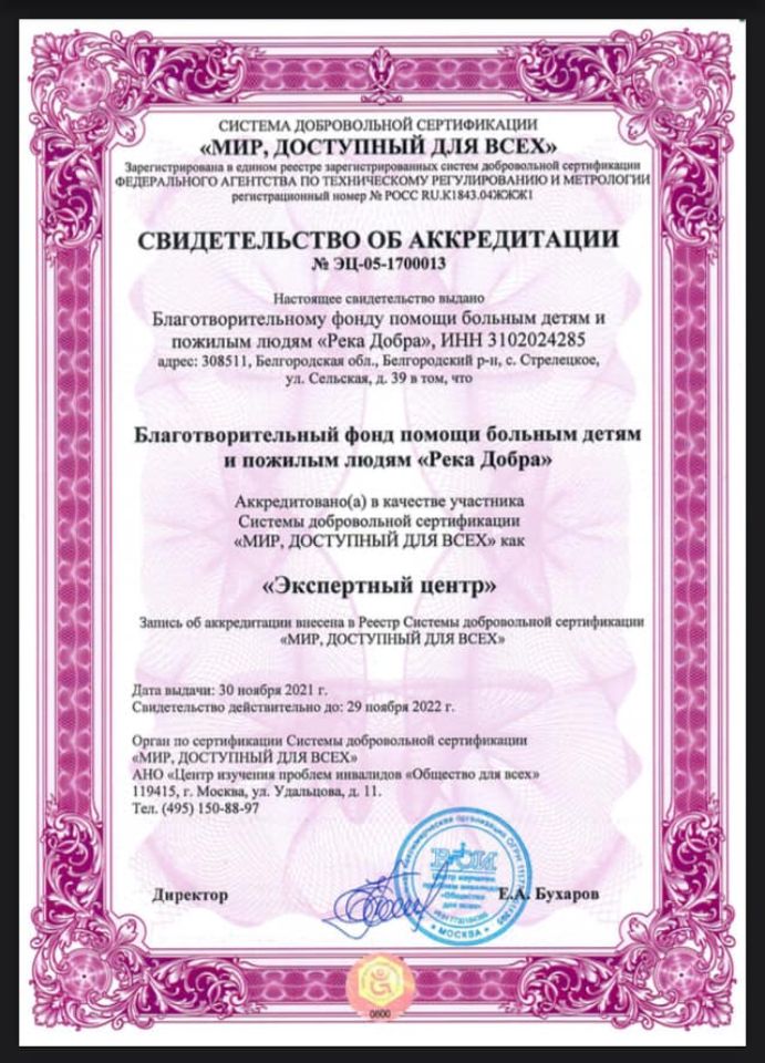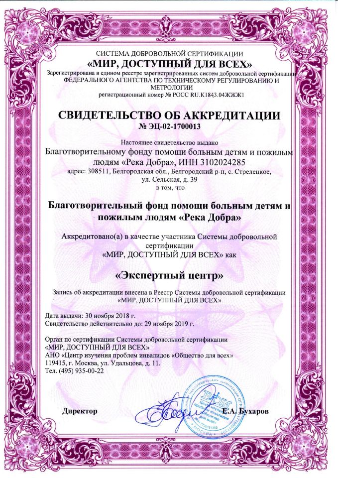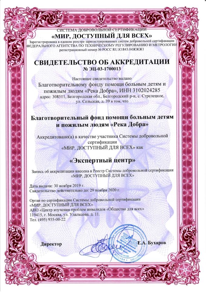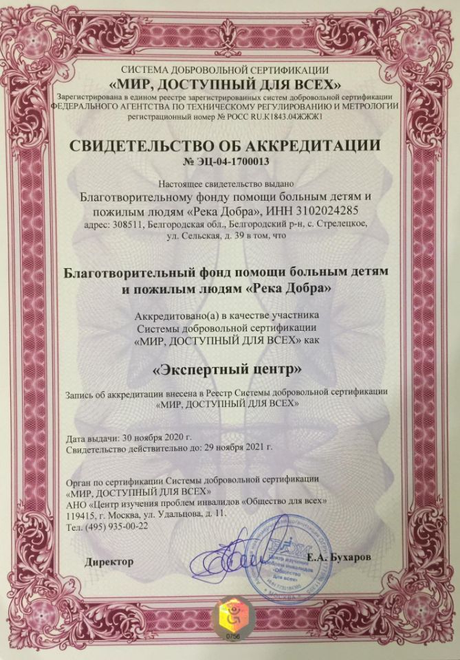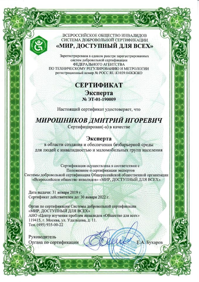 Каждый год, начиная с 2017, ЭКЦ "Доступный город" подтверждает свой уровень и продлевает аккредитацию в Системе добровольной сертификации «МИР, ДОСТУПНЫЙ ДЛЯ ВСЕХ».